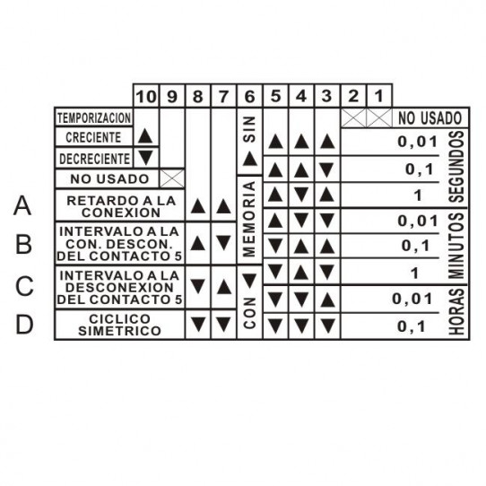 Supply voltage .... 12 VDC; 24 VDC; 24 VAC; 48 VAC; 110 VAC; 230 VAC Output contact .... Max. 8A 250 VAC Selection of time scale, function and timing direction .... Side DIP switch Connection .... Base undecal